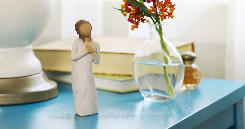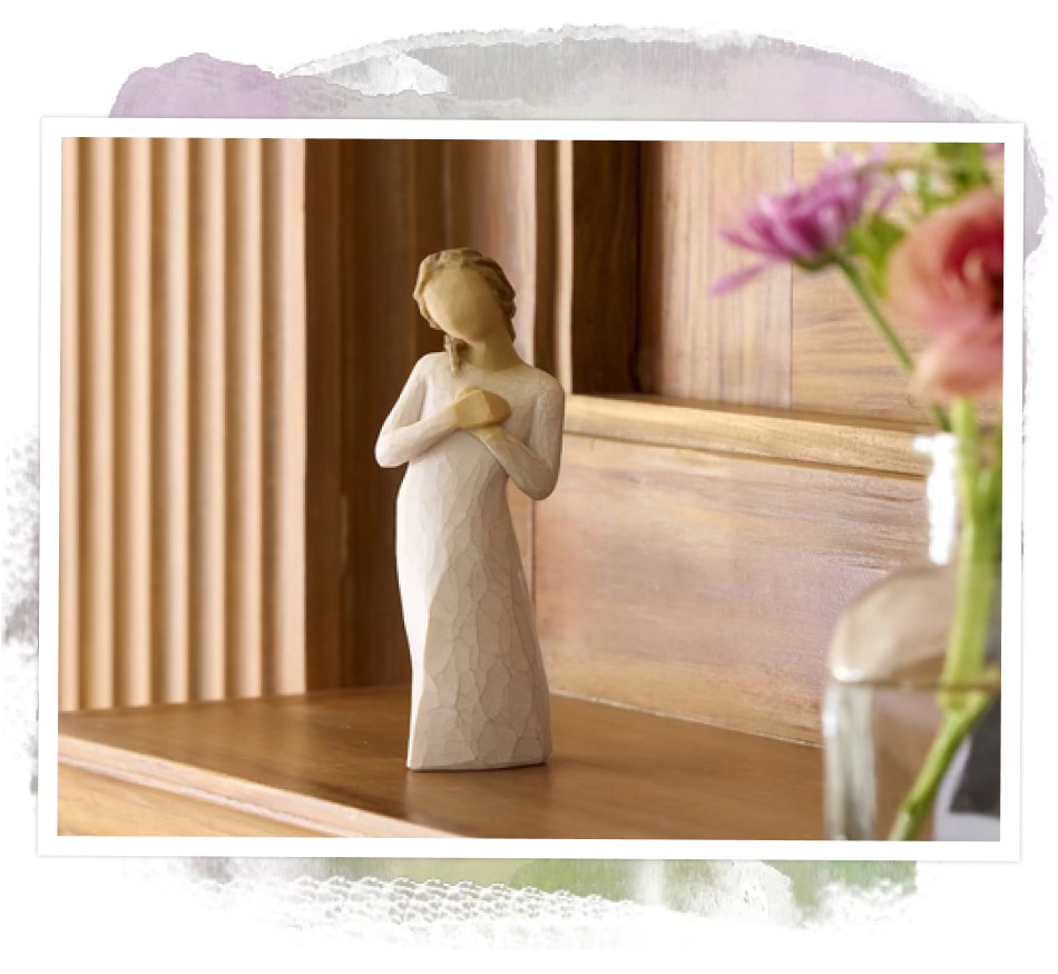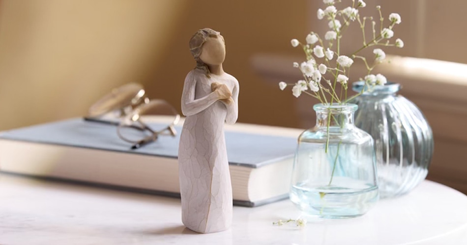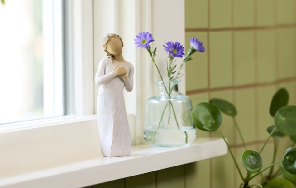 Here for Youย is a figure with hands to heart and a comforting, quiet presence.ย She can be a reminder of those who are thinking of you, and wishing you the best; a tangible symbol of connection and support.